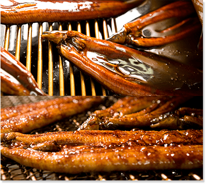 White grilling is done over high heat, with delicious results. Before broiling, we steam the eel so as not to lose its natural flavor and to soften the skin. Sauce is carefully applied, and the eel is broiled. This grilling process is repeated 4 times to make tender, aromatic broiled eel.